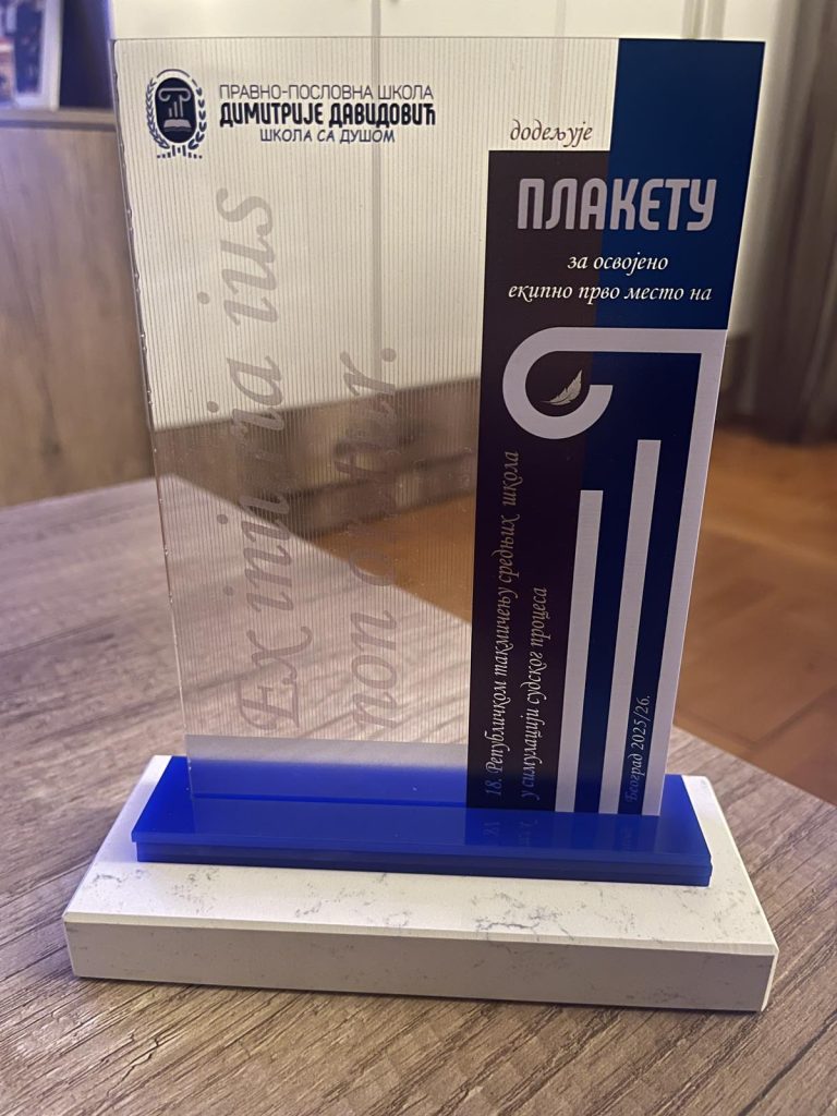 Правно-пословна школа „Димитрије Давидовић“ из Земуна је 17 и 18-ог априла била домаћин 18-ог Републичког такмичења у симулацији судског процеса. У конкуренцији 11 екипа из целе Србије најбоља је била Правно-пословна школа Ниш, испред екипе школе домаћина и средње школе „Младост“ из Петровца на Млави. Наши ученици остварили су одличне пласмане и у појединачној конкуренцији: Милица Јеленковић је проглашена за најбољег вештака, Марика Георгиjeв за најбољу окривљену, Лука Гавриловић је био други у конкуренцији сведока, као и Теодора Радоњић међу тужиоцима и Ива Миладиновић међу браниоцима, док је Николас Ракић освојио треће место у конкуренцији судија.