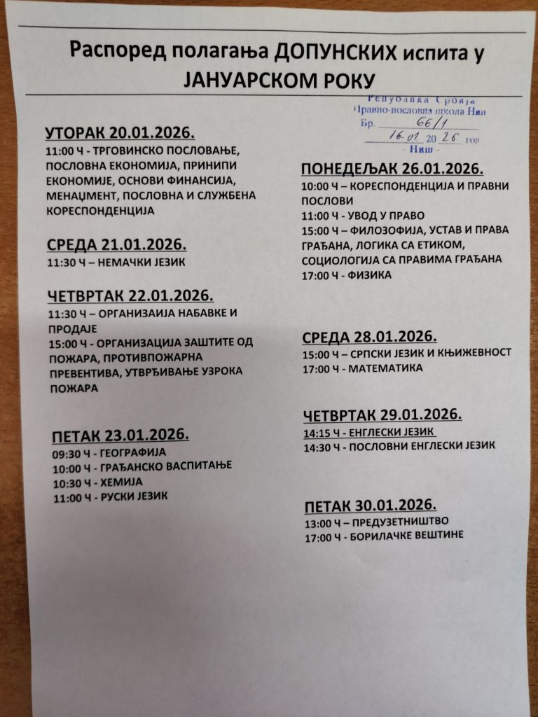 Распоред полагања допунских испита у jaнуарском испитном року школске 2025/2026